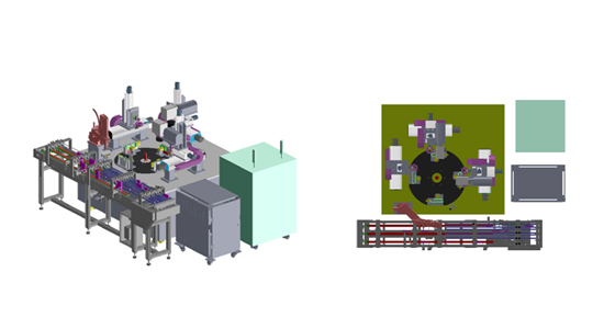 该设备用于电芯顶盖焊接,由激光器、振镜焊接头、XYZ三轴数控轴、焊接夹具、CCD自动对位系统、条码扫描及数据采集系统、水平四关节上下料机器人等构成。其主要作用是:将电池从流水线上夹持到焊接工作台进行焊接作业并采集电池焊接相关信息,在焊缝检测完成后将良品与不良品放入流水线上相应的导槽中。流水线部份由流水线板链,导槽,挡板,定位气缸,储料气缸等构成,设置有上料导槽,良品导槽及不良品导槽, 其主要作用是给电池焊接机输送电池,并具有一定的储料功能。